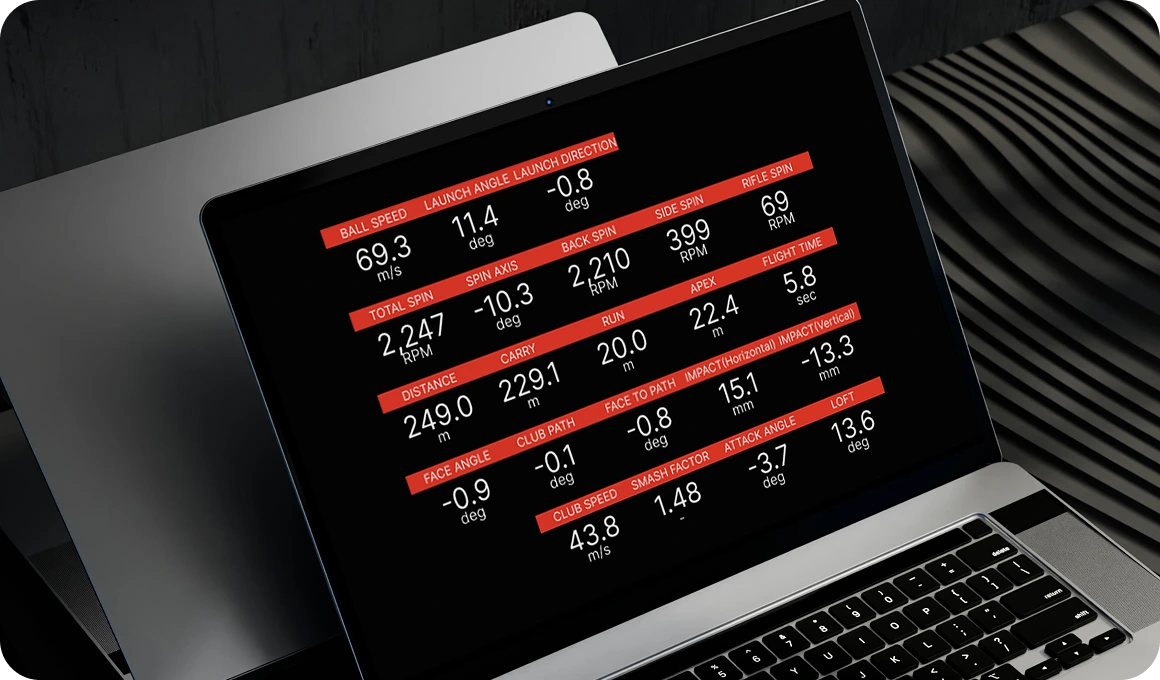 Provides a total of 23 types of club, ball, and flight data in real time for precise and objective swing analysis.Club data (8 types): club speed, face angle, attack angle etcBall data (7 types): ball speed, launch angle, spin etcShot/Aviation data (8 types): carry, total distance, run